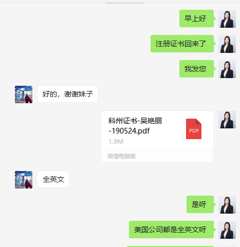 5月17日,吳女士便與鷹飛國際簽訂了美國公司注冊的合同,開始準備資料,核名,做合同繳費環節。5月22日,吳女士的美國科州公司注冊成功。