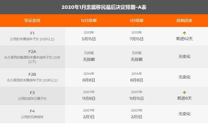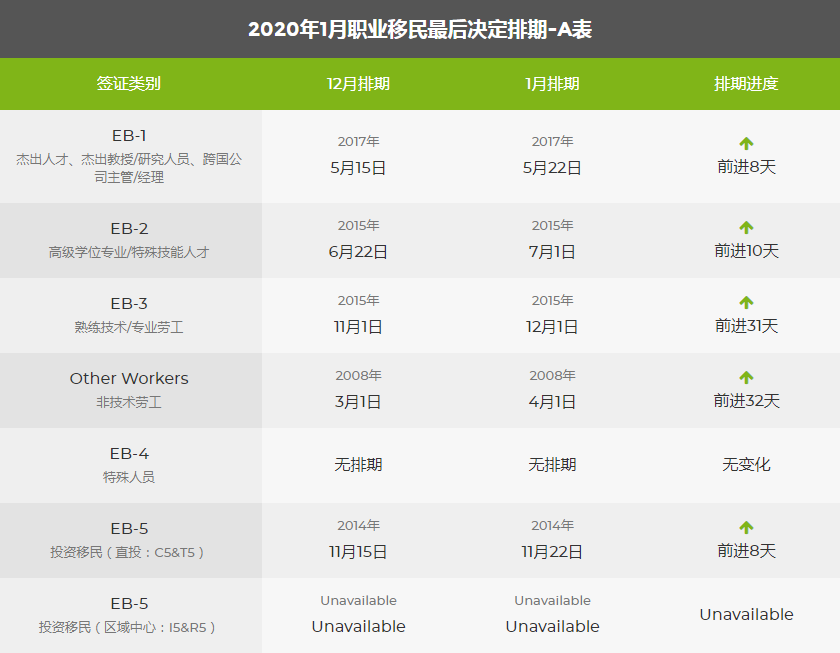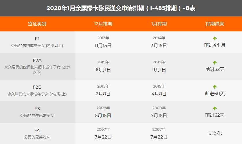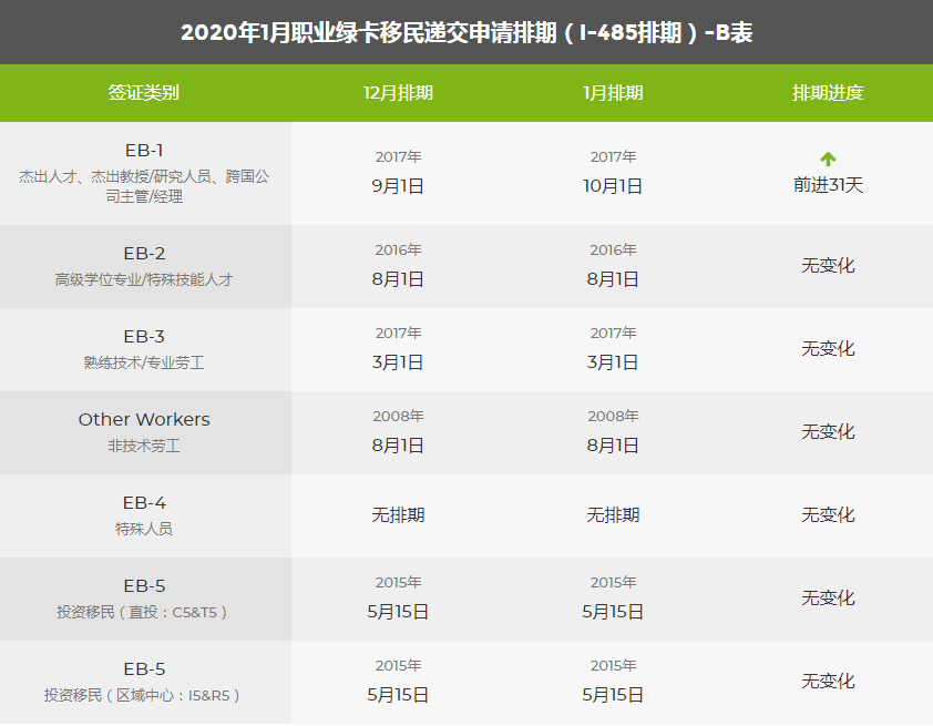2020年1月美國移民綠卡排期表