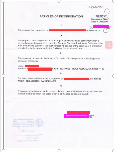 經過1個月的溝通,10月2號李先生與鷹飛簽約加州公司注冊+使館認證業務,并于11月30號完成注冊和認證業務。以下是李先生加州公司注冊成功的證書: