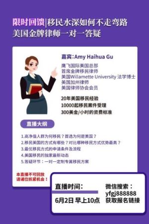 是的,6月2日(本周日)北京時間早10點,鷹飛國際金牌律師Amy Gu為各位對美國移民感興趣的朋友進行答疑解惑啦!