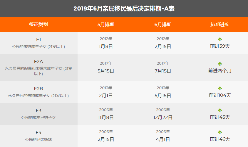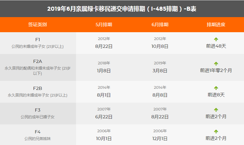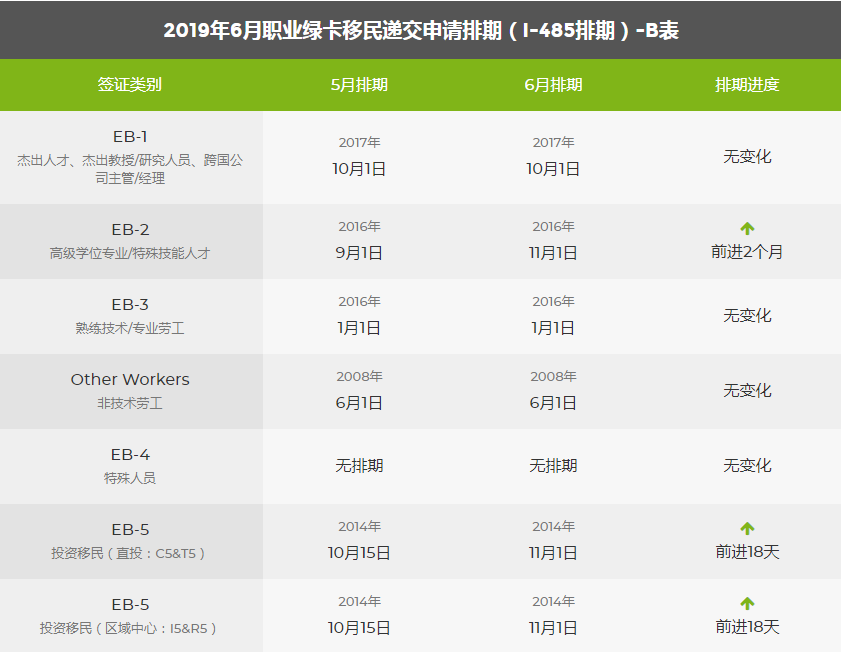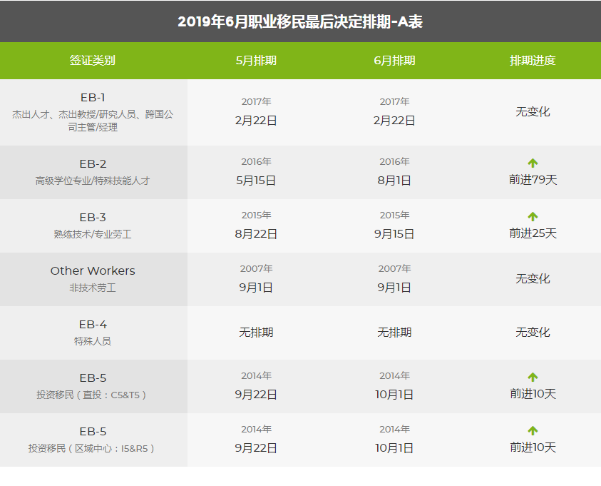 2019年6月美國移民綠卡排期表