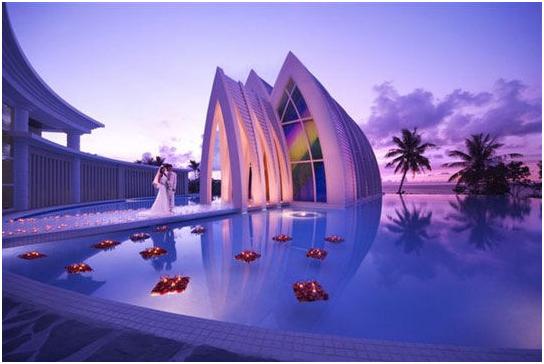 Chapel)又被稱之為“海的教堂”,它是亞洲最具人氣的婚禮堂,是偶像劇《惡作劇之吻II》及梁靜茹MV《小手拉大手》的婚禮場景拍攝地。它位于關島PIC太平洋度假村內,是關島島上第二座以婚禮村做概念而設計的教堂。教堂的整體設計元素是水,教堂外部的基底和室內都是純白色,配上彩虹色的玻璃,使得整座教堂就像浮在水面上的一條彩虹一樣,也象征著新人由此走向美麗的天堂。這座教堂是2006年9月才建造完成的,即便如此也引來世界無數情侶們的結婚預約,梁靜茹拍攝MV《小手拉大手》時,甚至是以“插隊”的狀態完成的,教堂的美使得她激動地在現場對男主角大喊:“不如我們結婚吧。”