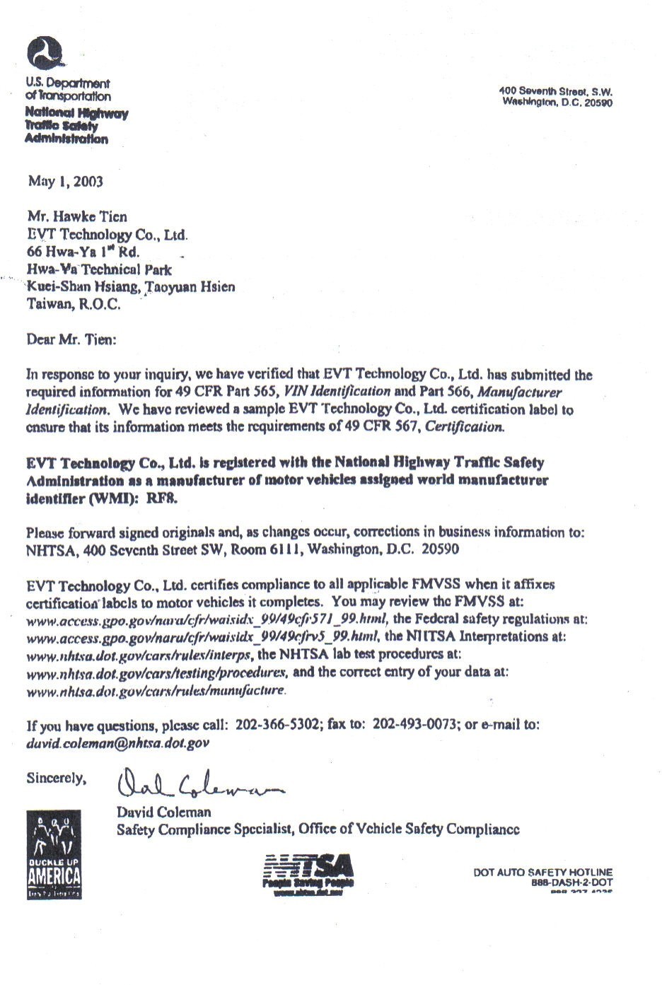 DOT 批準函 由于產品的類型不一樣,沒有固定的格式,共同點用的是DOT的信箋。