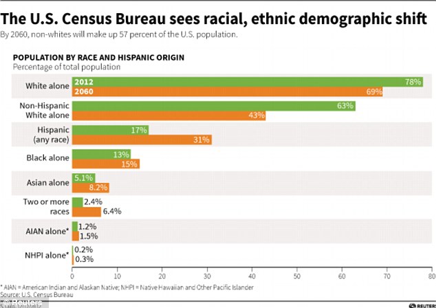 預(yù)計(jì)到2060年,少數(shù)族裔人口比例將從目前的37%,增加到57%,到時(shí)候沒(méi)有哪個(gè)族裔是多數(shù)族裔,雖然白人那時(shí)還是最大的族裔,占總?cè)丝诘?3%。