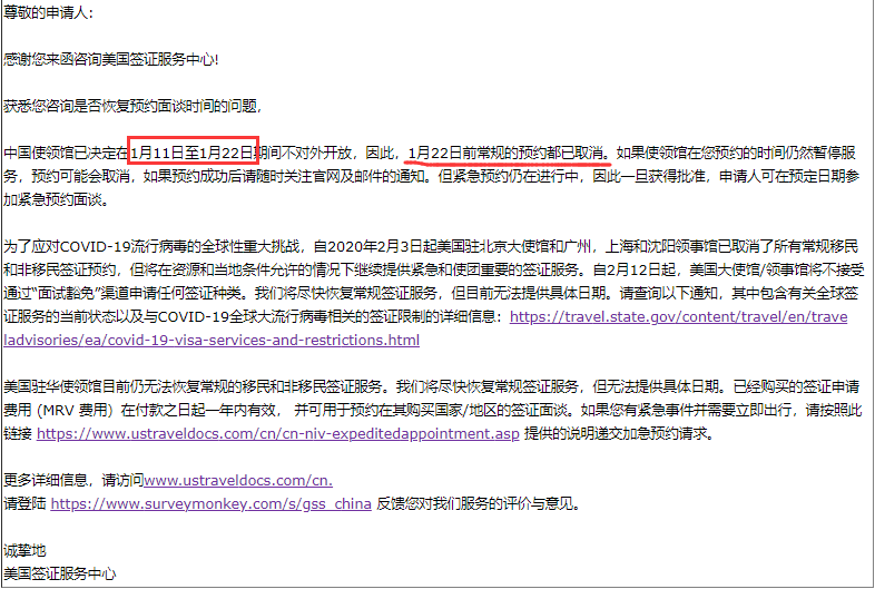 而近日,中國使領(lǐng)館也表示在1月11日至1月22日期間都不對外開放,1月22日前常規(guī)的預約都已取消。看來只有疫情有效控制或者結(jié)束,美國簽證才能再次開放!